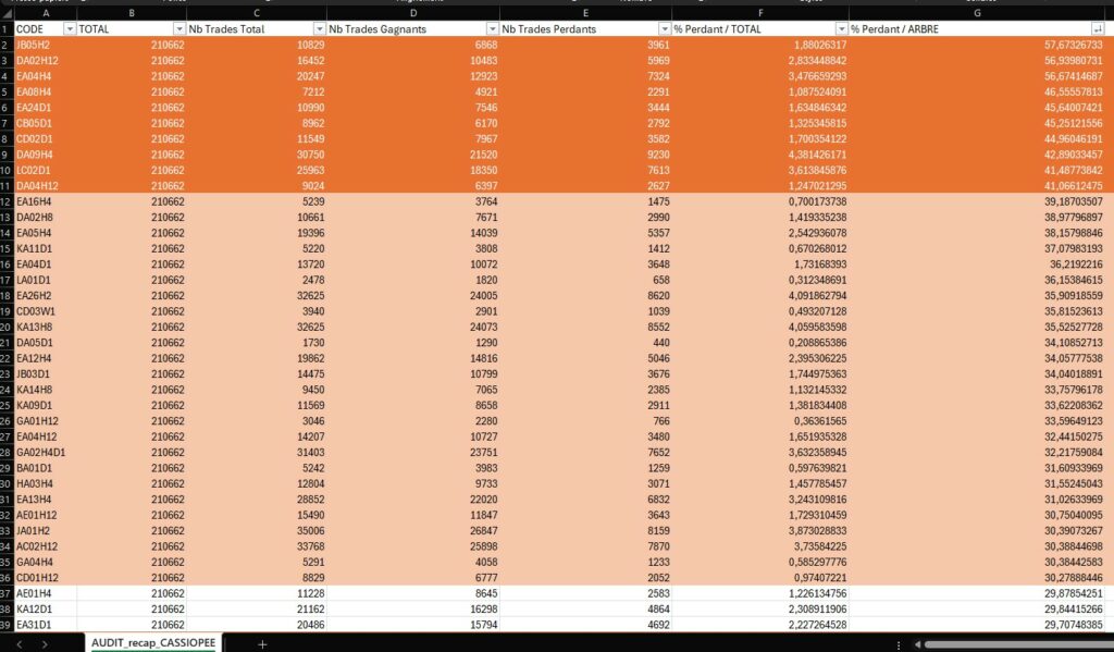 Ci dessus voici le type de fichiers qui peut nous aider dans cette tâche. Il représente les données statistiques collectées sur les 210662 trades de notre jeu de simulation, en fonction de chacun de nos arbres de décision.