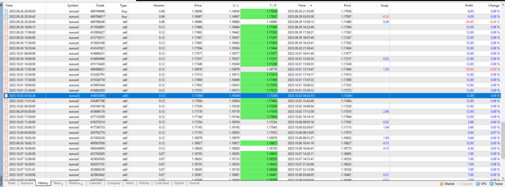 On observe ici l’illustration du comportement induit par les 2 méthodes précédentes, à savoir l’augmentation de la taille de position suite à une perte, et la clôture de trades “foireux” avant qu’ils n’aillent atteindre le SL qui leur a été assigné.